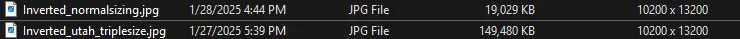 While that sounds huge, because we also scaled the output jpeg’s dpi, the two resulting jpegs have the same dimensions in pixels. The drastic difference in their file sizes hints at the much greater detail in the x3/100dpi version.